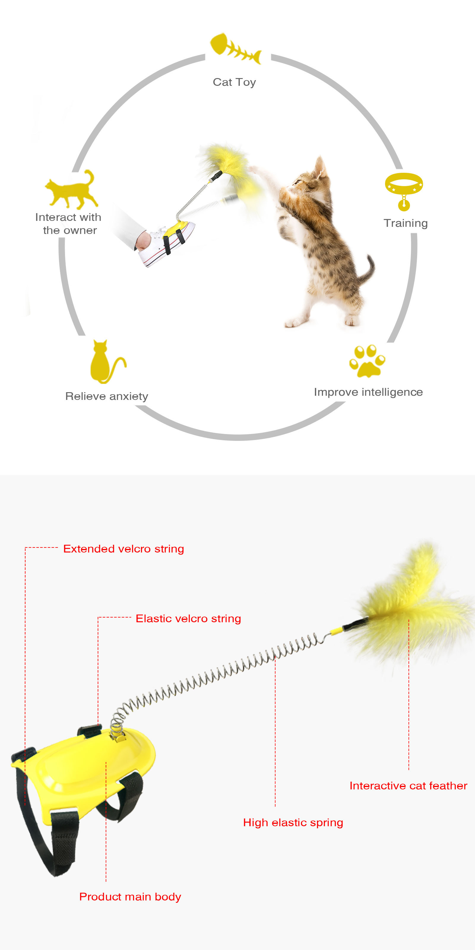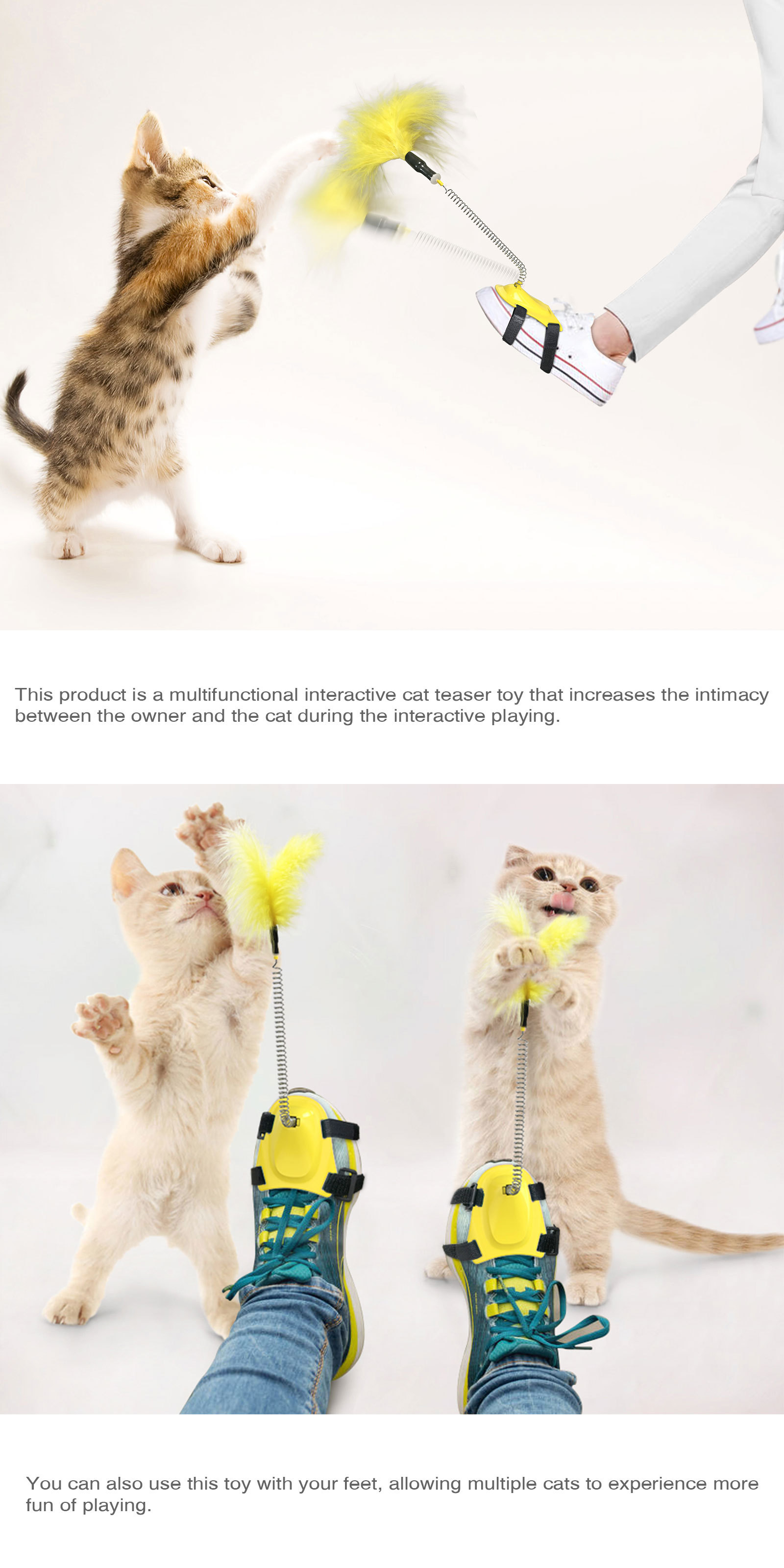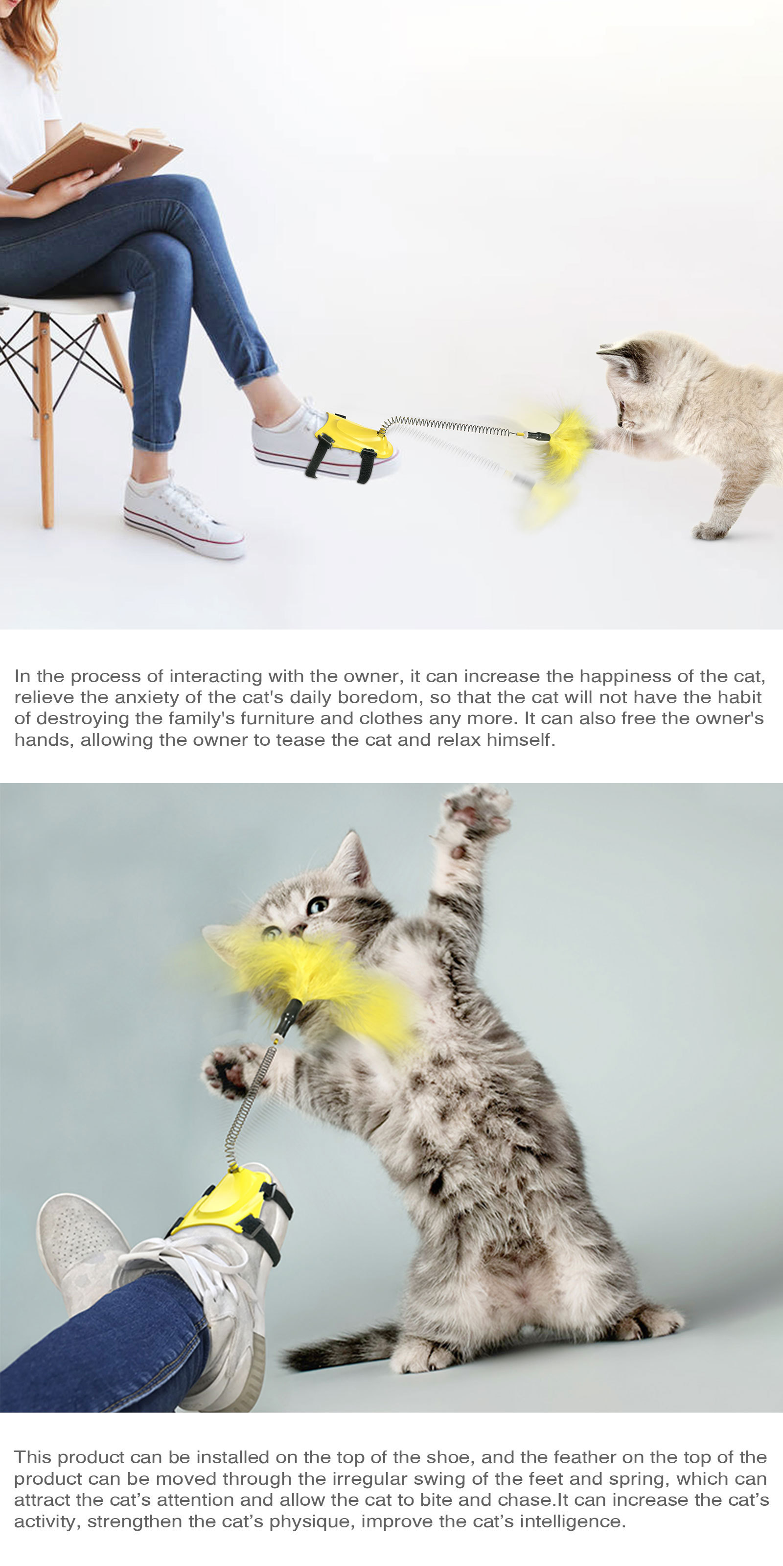 Cat stick toys: This product can be installed on the upper, and through the irregular swing of the foot and the spring, the feathers on the top of the product can be moved, which can attract the cat's attention and make the cat jump, chase, flap and play. It can increase the cat's activity, enhance the cat's physique, and improve the cat's intelligence.