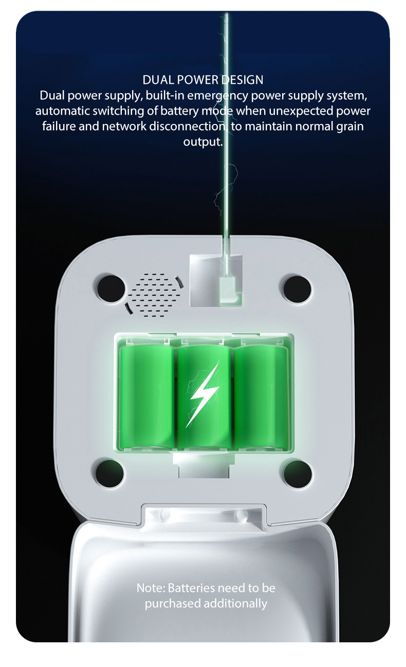 Smart To Use: Support Both Ac Power And Battery (3 D-cell Alkaline Batteries Not Included). Once Unplugged Or Power Outage, The Feeder Will Automatically Divert To The Battery Powered Mode For Continuous Operation.