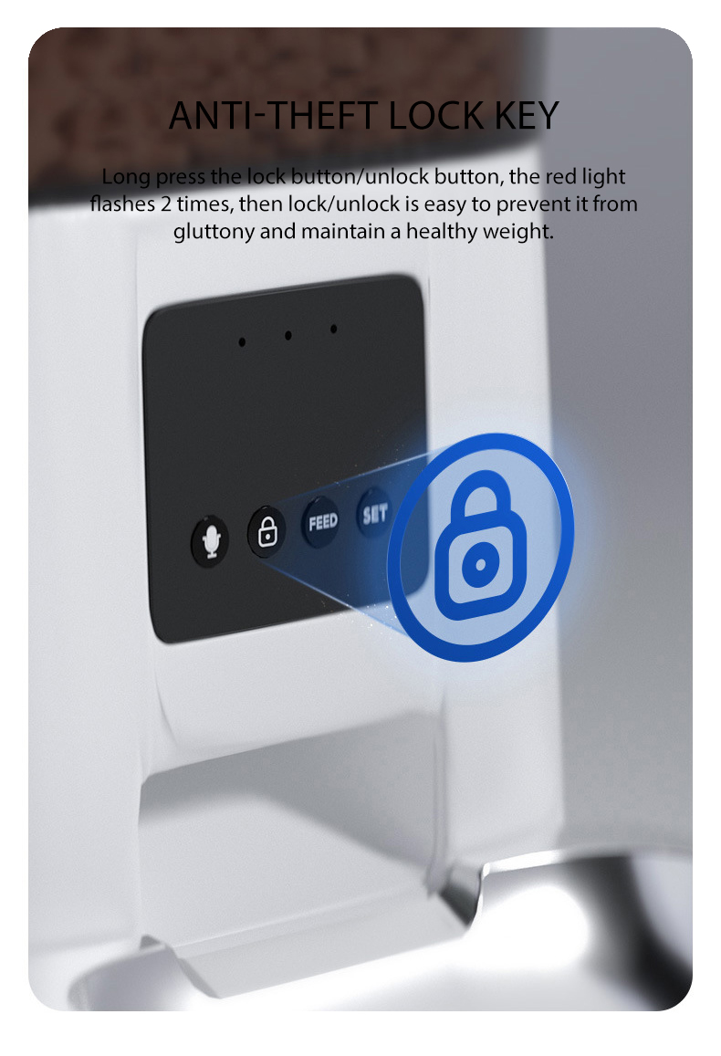 Convenient & Safe Design: The Auto Pet Feeder Has A Replaceable Moisture-proof Desiccant Box In The Lid To Keep Your Pet's Kibble Fresh, While The Timed Cat Feeder Locking Mechanism Ensures They Cannot Open The Lid To Sneak Any Extra Kibble.