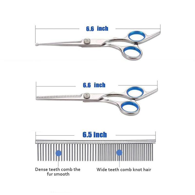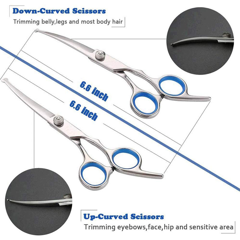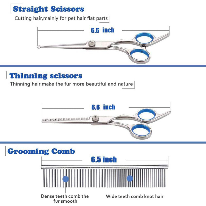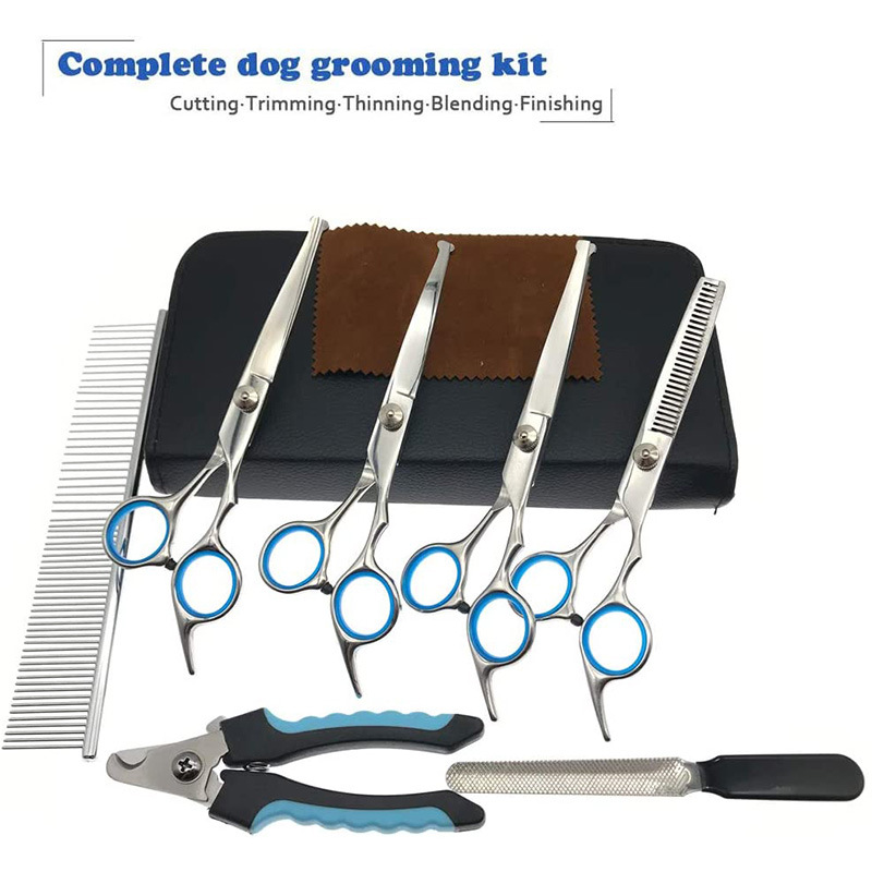 Perfect Pet Grooming Scissors Kit: Pet Grooming Scissors Kit Includes 6.5-inch Thinning Shears, 6.5-inch Curved Scissors, 6.5-inch Straight Scissors, Nail Clippers, Nail Files, grooming Comb, Cleaning Cloth, And Stylish Black Leather Case. So It Can Trim Any Part Of Your Pet Such As Body, Face, Nose, Ear, Tail, Paw Etc.